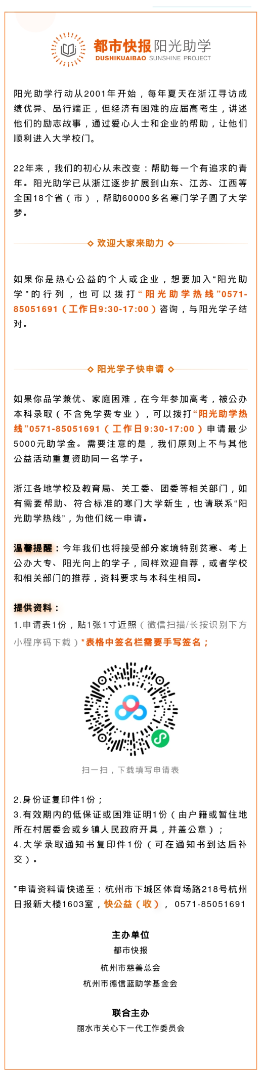 如果您也想帮助寒门学子圆大学梦,或者您身边有希望圆梦的寒门学子,都可以拨打都市快报阳光助学热线0571-85051691(工作日9:30-17:00)咨询,谢谢你们对阳光学子的支持和鼓励。您也可以关注“快公益”微博、微信,获取更多助学信息。