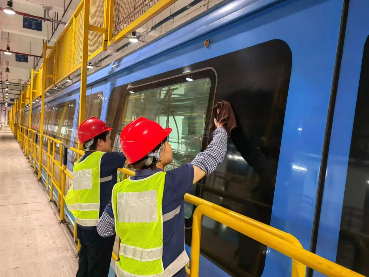 夜晚,主要执行车厢内部座椅、扶手、玻璃、司机室等列车内部的清理、消杀。